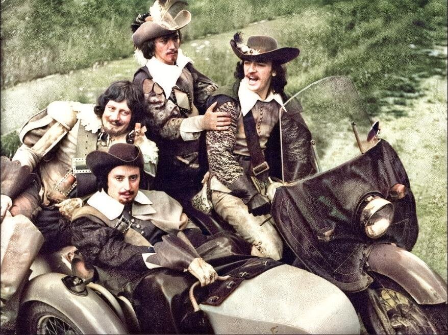 А вот другие чудеса. Мушкетеры, казнив Миледи, едут пропивать подвески королевы.