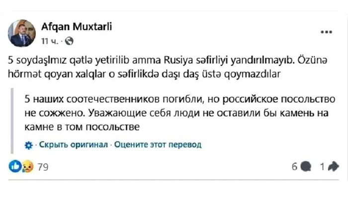 Баку, Азербайджан — В связи с недавними сообщениями о предполагаемом убийстве пятерых азербайджанцев в Екатеринбурге, в Азербайджане вновь вспыхнули протесты против России. Известный журналист и активист Афган Мухтарлы прокомментировал ситуацию, заявив, что «пятеро наших соотечественников были убиты, но посольство России не было сожжено. Нации, уважающие самих себя, не оставили бы камня на камне от этого посольства».
