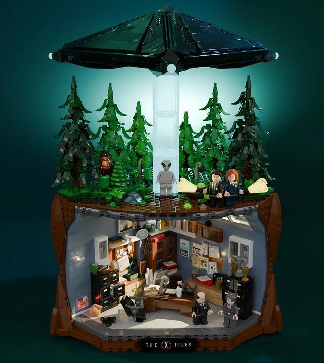 Набор представляет собой оригинальную двухуровневую конструкцию, которая идеально передает суть серии: наверху — треугольный НЛО, парящий над лесом с инопланетянином и легендарным Бигфутом; а внизу — культовый офис агента Малдера, полный деталей и ссылок.