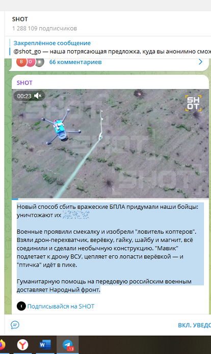 На ролике мы видим, как буквально, веревкой с гайкой и магнитом, сбивают украинские БПЛА. И всё это снято с российского беспилотника.