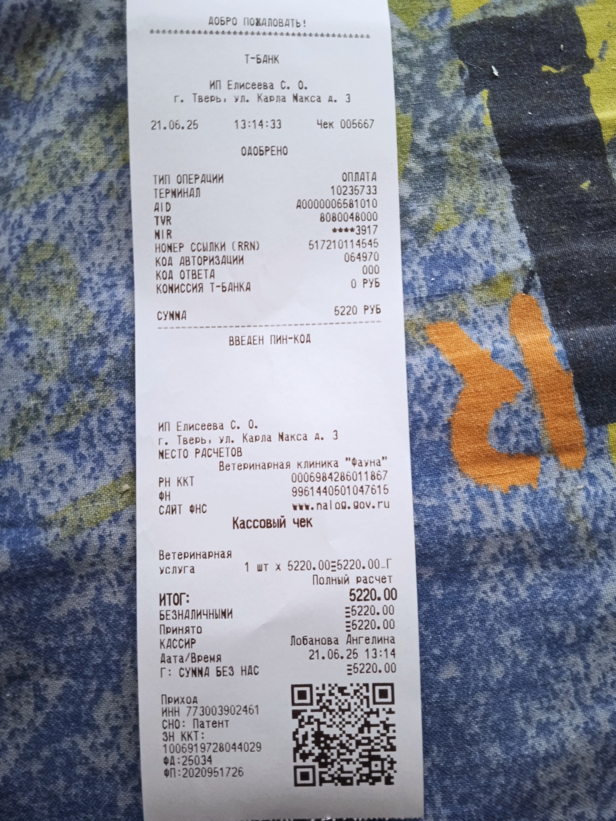 И это не простые слова... Ниже я привожу чек, в котором указана оплата ОДНОГО такого посещения! 5 220 рублей за полуторачасовой визит к ветеринару с учётом 10%-й скидки для пенсионеров... И это не считая расходов на лекарства, которые необходимо было приобрести в обычной аптеке... Итоговый счёт в результате не хитрых арифметических действий, – 6 тысяч рублей.