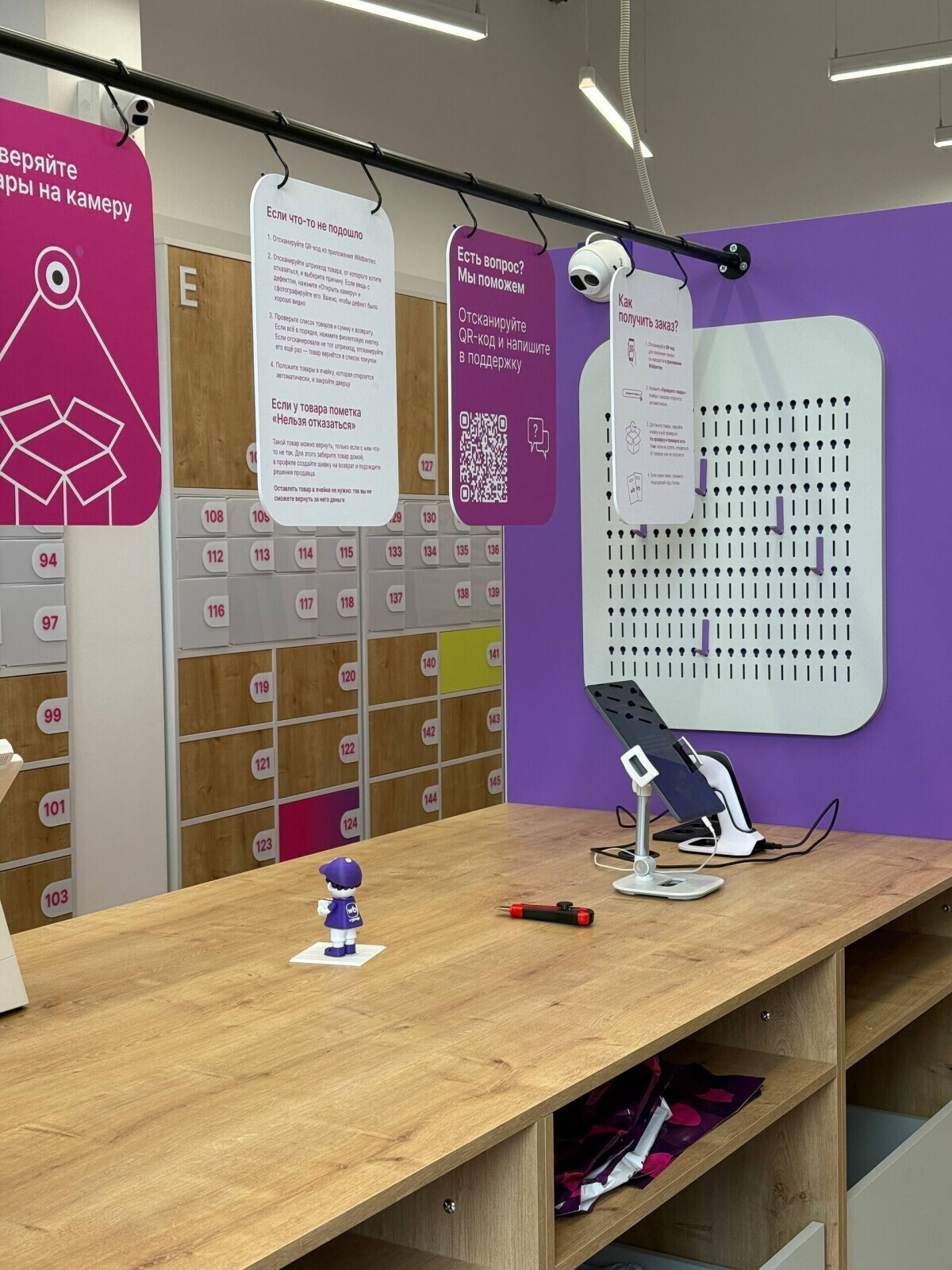 Войти в пункт можно по QR-коду. Покупатель сам сканирует его внутри и система открывает ячейку с заказом. Есть примерочные кабинки, если товар вам не подошёл, есть возможность вернуть его обратно. Пока всё работает в тестовом режиме. Есть нюансы по заказу товара, в ячейку помещаются габариты 35х45х38 см, стоимость заказа не должна превысить 25 тысяч рублей. Все подряд в помещение пройти не смогут, вход только для покупателей, которые оплатили покупку именно в этом (ПВЗ).