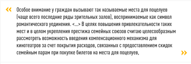 Значит как я понимаю, депутат думает, что если парам дадут скидки в кино, они будут чаще ходить смотреть фильмы, станут крепче любить друг друга и в стране будет больше детишек. Слова, слова ,а где же дело?
