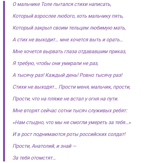 Марина Ахмедова, правозащитница и главред новостного агентства, считает, что Толя, который погиб, защищая маму, заслуживает орден Мужества. Она уверена, что Толя поступил как настоящий герой.