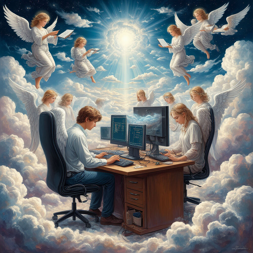 — Это что, уже не считается духовным ростом? — спрашивает ангел-стажёр Арсений, пряча пачку светящихся чисел в облачную сумку IKEA.