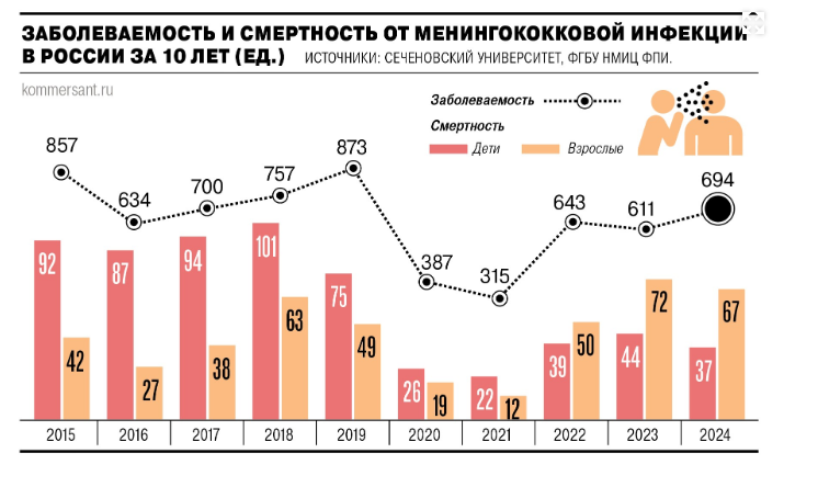 Наши врачи думают, что этого менингита стало больше из-за того, что в Россию приезжает много людей на работу, а кто их обследовал на их родине одному богу известно. Врачи хотят, чтобы всем детям и подросткам обязательно делали прививку от менингита, а также чтобы компании заставляли приезжих рабочих делать эту прививку( хватит таскать заразу в Россию).