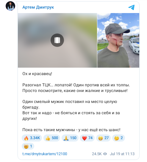 «Ох и красавец! Разогнал ТЦК лопатой! Один против всей их толпы. Просто посмотрите, какие они жалкие и трусливые!» — написал парламентарий, не уточнив, о каком населенном пункте идет речь.
