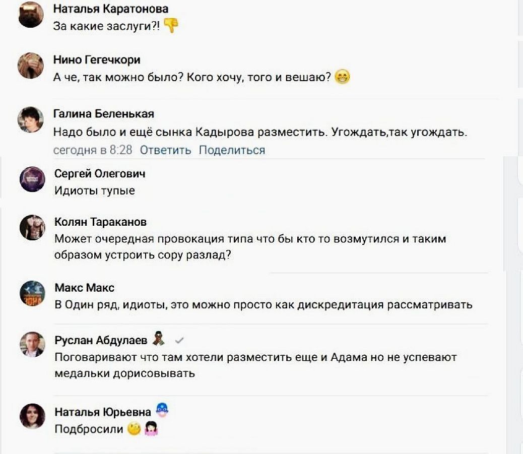 Пользователи Сети были тоже удивлены и, если некоторые назвали всё происшедшие провокацией, то другие ещё больше удивились тому, что на стене почёта не было портрета прославленного куратора и орденоносца Адама Кадырова
