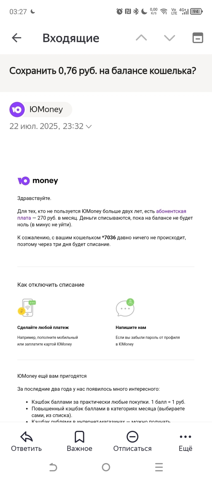 О важном: читайте элписьма, пуш-уведомления ваших приложений или сайтов, где вы зарегистрированы. Юмоней - абонентская плата за непользование ...
