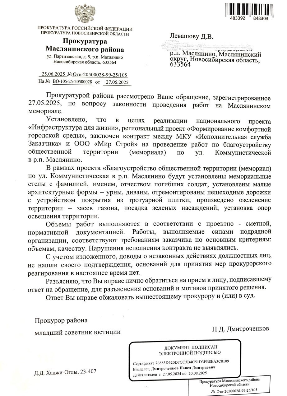 Первая ласточка. Пришел долгожданный ответ из прокуратуры Маслянинского района по поводу «благоустройства» Маслянинского мемориала