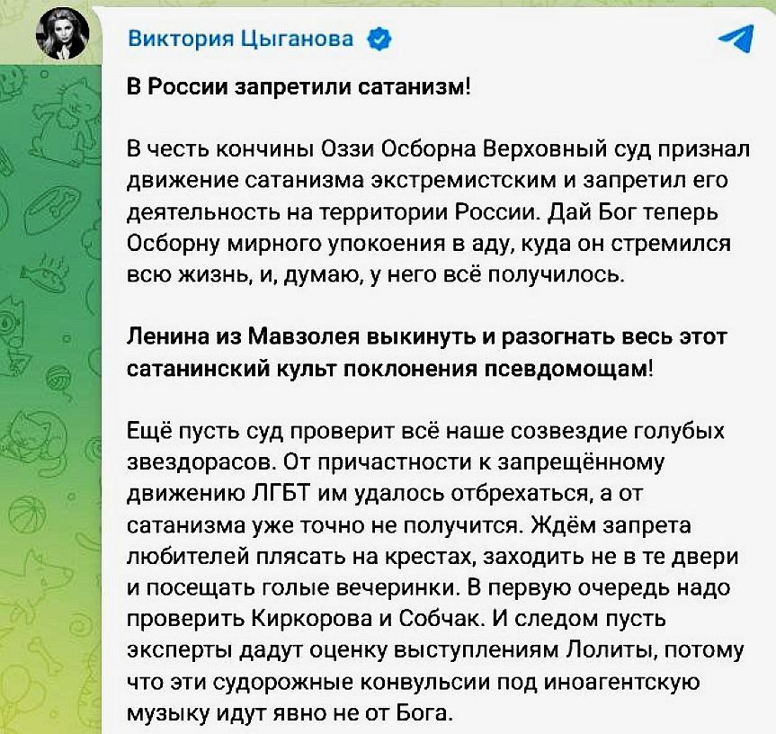 В своём телеграм-канале Вика Цыганова опубликовала радостно-яростный пост, где пожелала адских сковородок недавно умершему Оззи Озборну, поганым словом помянула Ленина, призвав «выкинуть» его из Мавзолея и, совершенно справедливо высказалась о известных и потрёпанных «звездорасах», которые так и сидят за не той дверью.