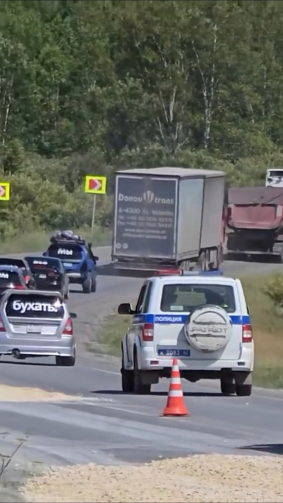 В России сняли «алкогольный» кортеж из легковых машин. На каждой машине были расклеены надписи, которые вместе составляют фразу: «Мы все снова едем бухать».