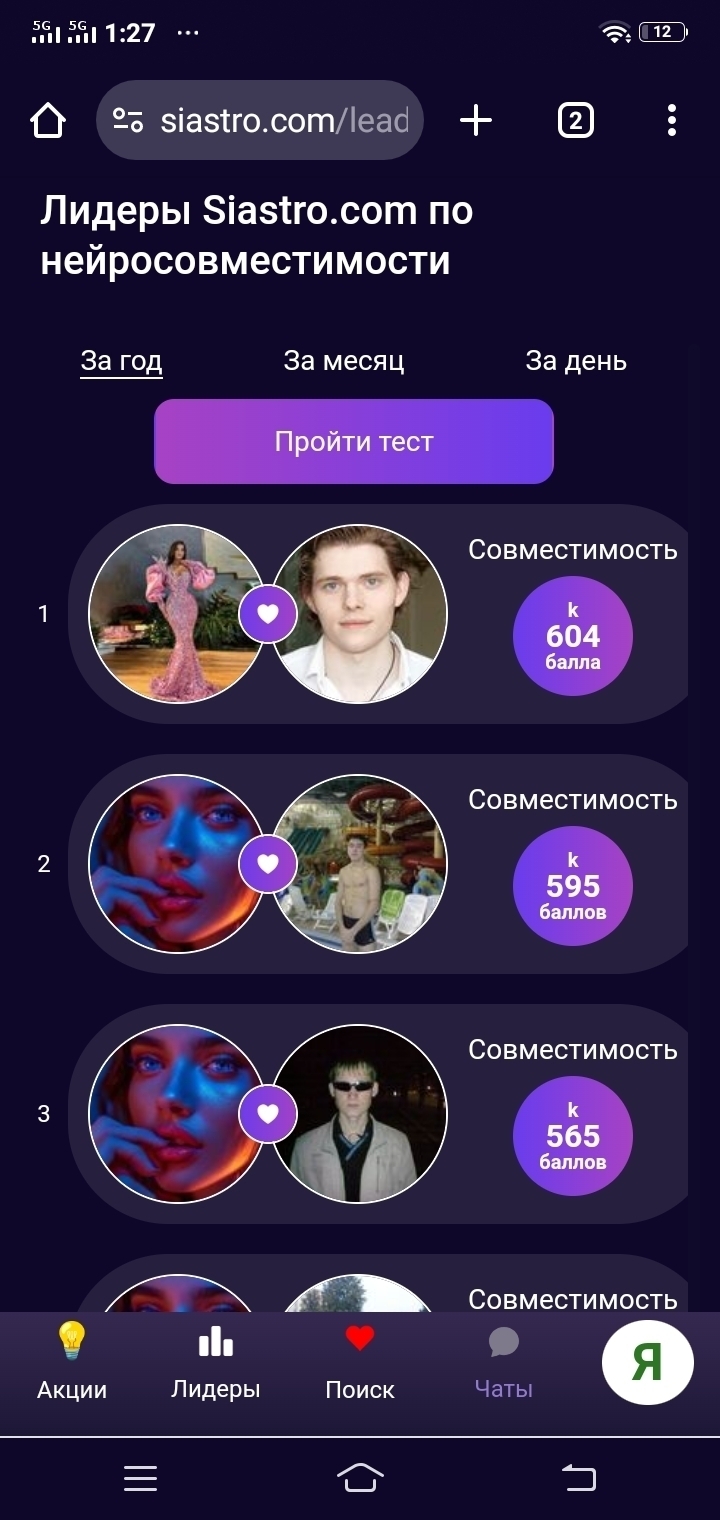 Напоминаем, что до подведения итогов акции Siastro "Найди пару" осталось 10 дней! Татьяна и Maksim - 1 место. Rushan и Ирина - 2 место.Begimai и Юрий - 3 место. Возможно, именно вы встретите на сайте человека,...