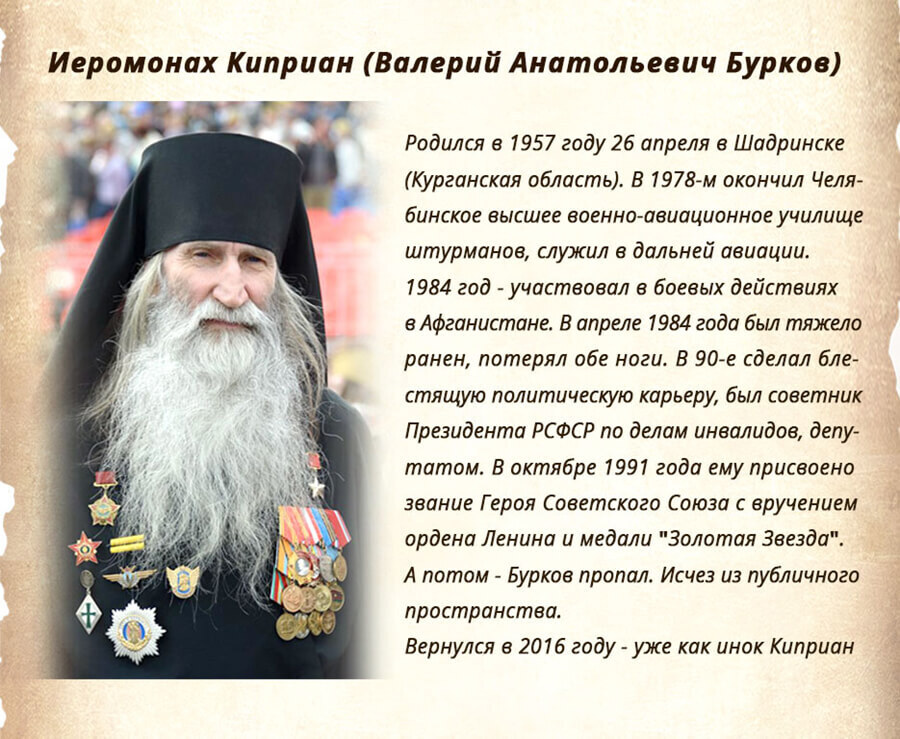 Краткая информация об этом человеке...."Валерий Анатольевич Бурков известен как один из последних офицеров, получивших звание Героя Советского Союза. Кадровый военный во втором поколении, авианаводчик, он потерял в Афганистане обе ноги, пережил три клинические смерти, выжил и вернулся в армию. В 90-е сделал блестящую политическую карьеру, был советником Президента РФ, депутатом. А потом - Бурков пропал. Исчез из публичного пространства. С 2009 по 2016-й - словно дыра в его биографии. Вернулся в 2016 году - уже как инок Киприан. На вопрос, что произошло за эти годы, отвечает: «Я учился быть христианином».