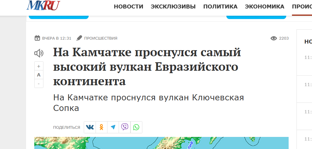 Неспокойно сейчас на Камчатке. Только вчера СМИ писали, что там активизировался самый высокий вулкан в Евразии — Ключевская Сопка. А сегодня сообщили, что произошло землетрясение.