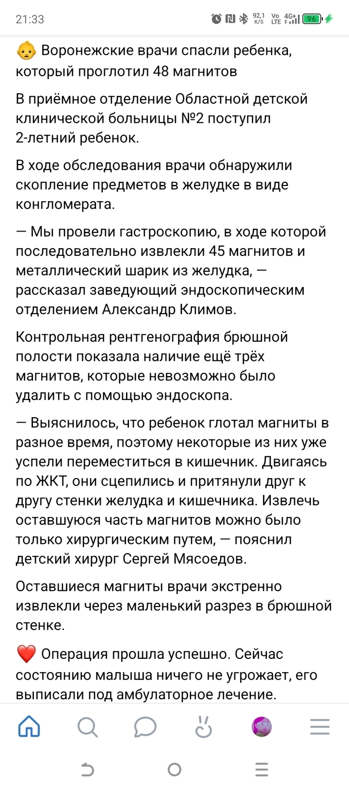2-х летний ребенок попал в приемное отделение клинической больницы г. Воронежа, в ходе обследования гастрокопия показала инородное тело в желудке. Из желудка извлечено 45 магнитов.