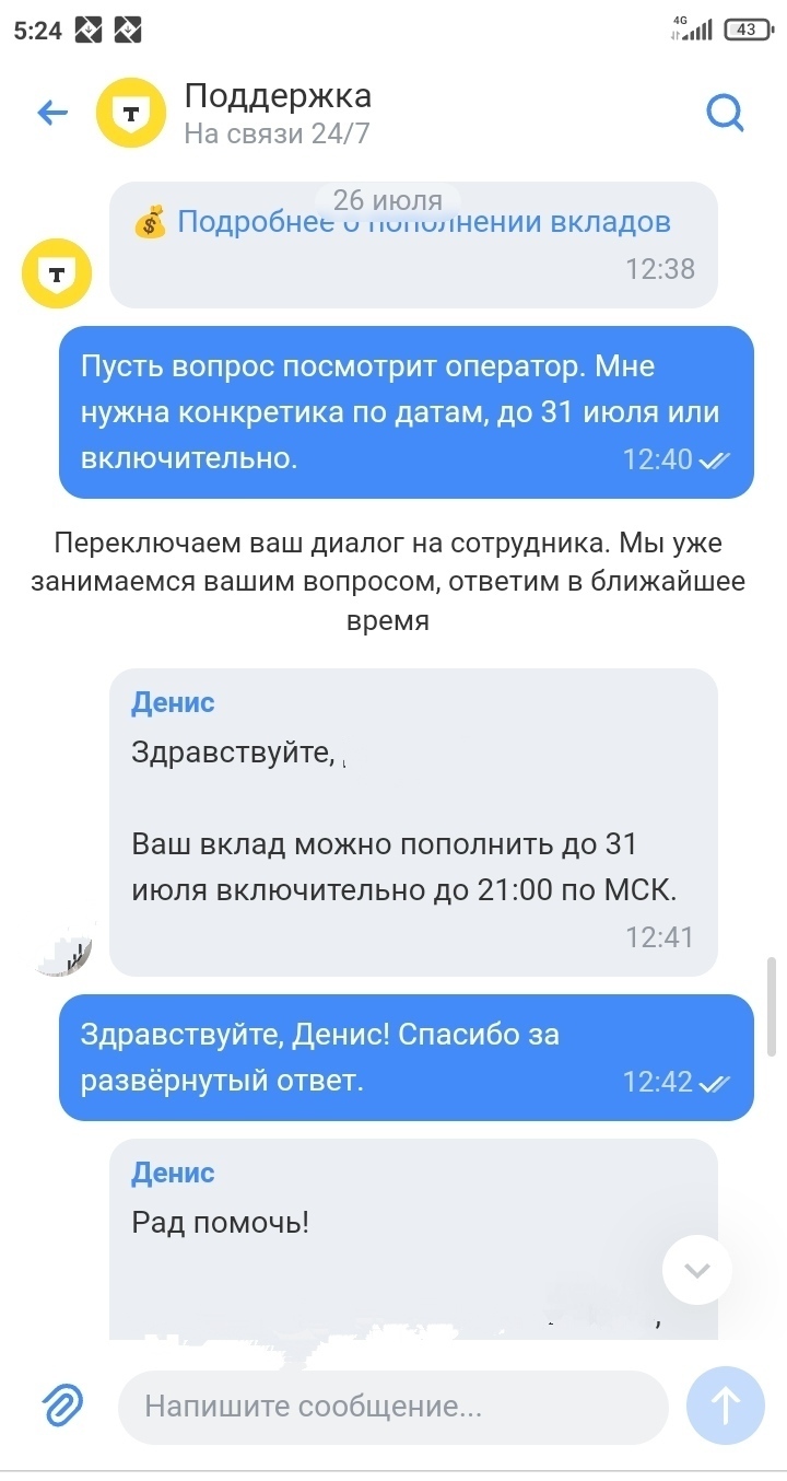 Обратился он к оператору и оператор на советовал как внести деньги на вклад, но ничего не помогало. Написали что ответ он получит до 1 августа включительно с решением проблемы, на что он написал, что до 1 ждать не может, так как пополнить вклад нельзя будет.