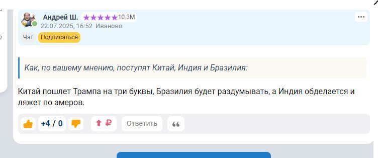 Трамп ранее предупредил о введении 25-процентных пошлин и других экономических мер против стран, чей бизнес имеет дела с российскими партнёрами, если не будет достигнуто мирное соглашение между Москвой и Киевом. Властям Индии Трамп пригрозил дополнительным штрафом за продолжение закупок нефти индийскими компаниями в России и за военное сотрудничество между властями Индии и России. Трамп потребовал от властей Индии по-хорошему запретить любые сделки с российскими компаниями. Из-за того, что индийские нефтяники закупают сырую нефть у российских, рискуют пострадать и другие отрасли, которые не имеют отношения к российским партнёрами, но могут иметь дела с партнёрами в США и ЕС. Санкции предусматривают принцип круговой поруки. Решение государственных властей Индии и руководителей нефтяных компаний вызвано тем, что они побоялись за другие отрасли экономики, которые не перед Трампом и не заняты в торговле с российскими резидентами.