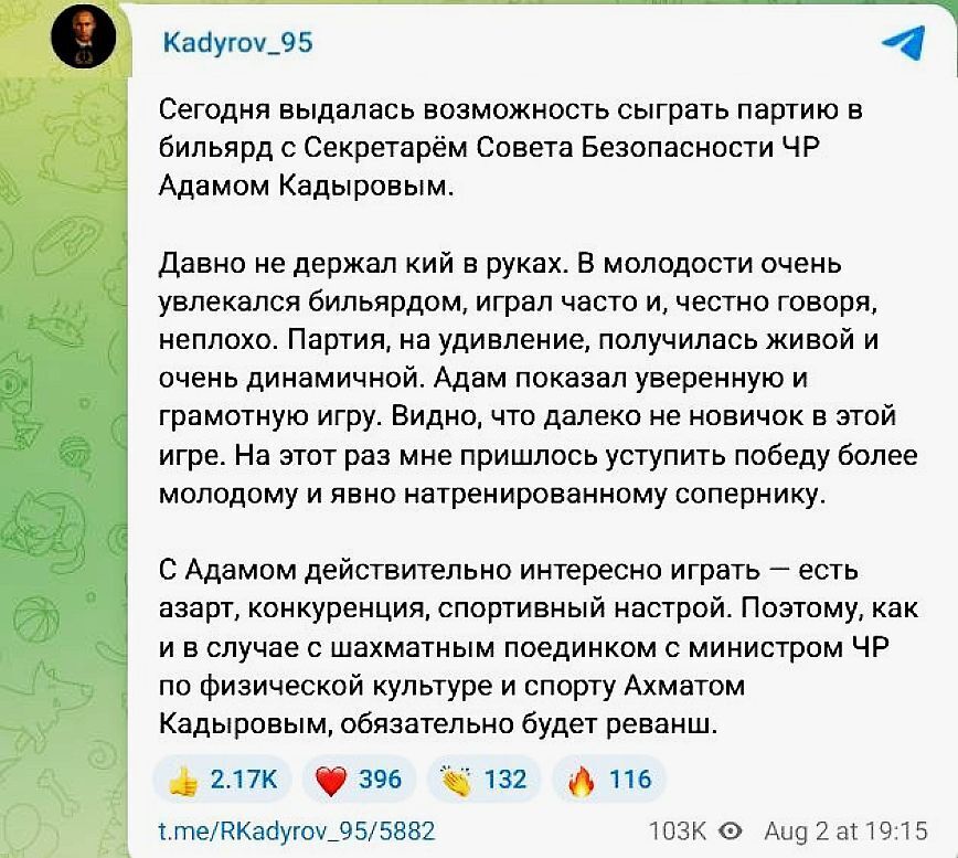 На днях, в своём телеграм-канале Рамзан Кадыров опубликовал пост о грандиозном поединке на бильярдном столе со своим сыном Адамом. Гениальный потомок оказался не только куратором и кавалером всего возможного, но и непревзойдённым бойцом зелёного поля.