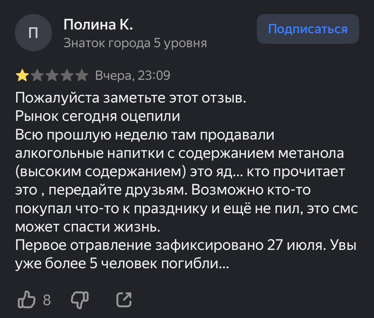 Поражает бездействие местных правоохранительных органов. Было уже известно о смертях, а палатка целую неделю продолжала торговать некачественным алкоголем. Как же так? Неужели никто не контролирует эту торговлю?