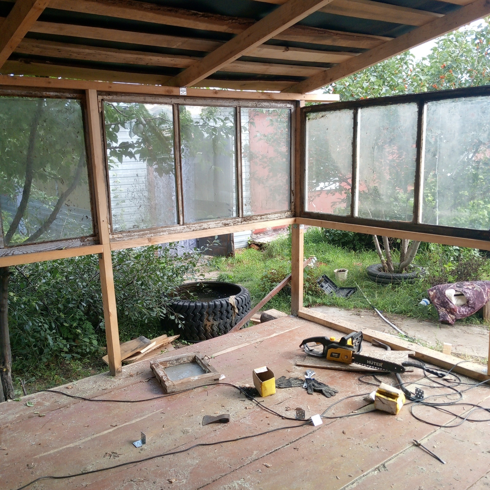 Далее начали прикручивать под окна бруски и устанавливать сами рамы со стёклами. Эти рамы мы почти задаром купили в местной школе лет пять наверное назад, когда там меняли окна на пластиковые. И тут выяснилось, что рамы по длине не входят в стену, эх... а так хотелось ряд окон от края до края. Но выход нашёлся, Серёжа - это мой дорогой муж, отпилил края брусков и окна встали на место , будто тут и были