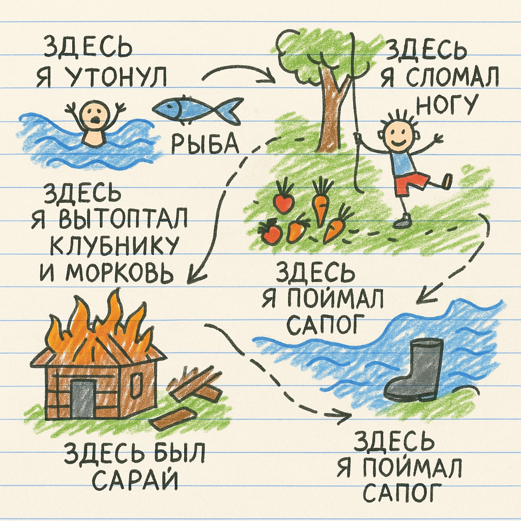 Потом я пошёл в огород. Хотел помочь бабуле, сделал секретные тропинки. Правда, они прошли прямо через морковь и клубнику. Теперь тропинки есть, а моркови и клубники нет. Бабушка сказала, что это «инновации», но как-то грустно.