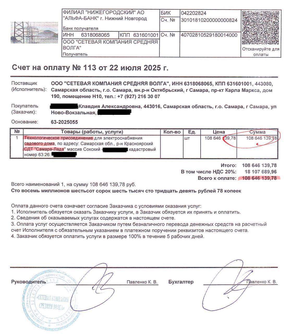 Счет в 108 миллионов рублей за подключение электричества к садовому домику в СНТ