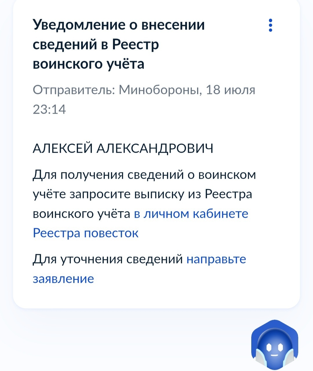 Ваши данные из базы* военкомата перенесены в реестр воинского учета. Такие сообщения получают мужчины по всей стране. Это не повестка, идти никуда не нужно.