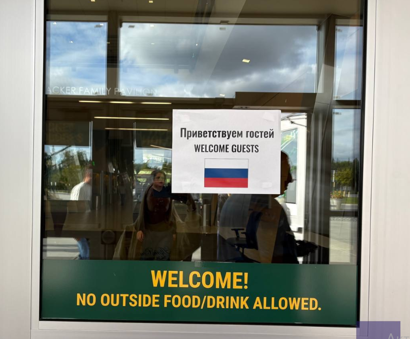 На входе в пресс центр гостей встречал украшенный российским флагом транспарант с надписью «Приветствуем гостей. Welcome guests». По всей территории были размещены таблички с надписями на русском и английском языках: «спальная зона», «душевые» и другие.