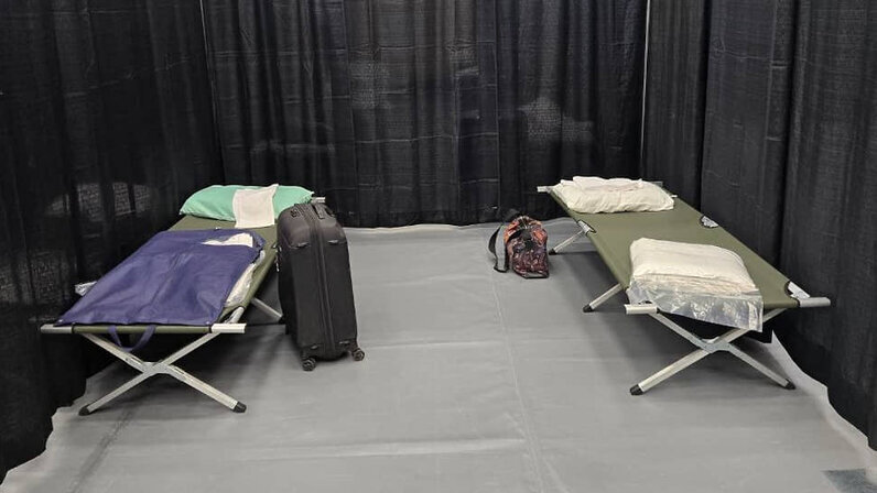 Спальное помещение напоминают мобильный госпиталь пандемийного периода. Кровати выставлены в стройные ряды. Между рядами установлены ширмы, которыми выгорожены отдельные двухместные боксы.