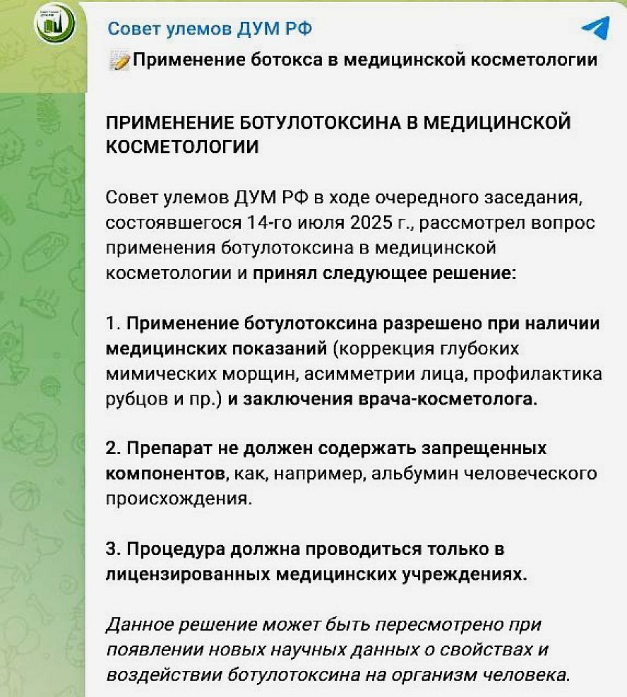 - Новые веяния дошли и до очень серьёзной организации - Совета улемов Духовного управления мусульман России (ДУМ РФ). Духовные руководители разрешили мусульманкам делать уколы ботокса, но только по медицинским показаниям, В противном случае, они попадут в грешницы и будут держать ответ перед Всевышним.