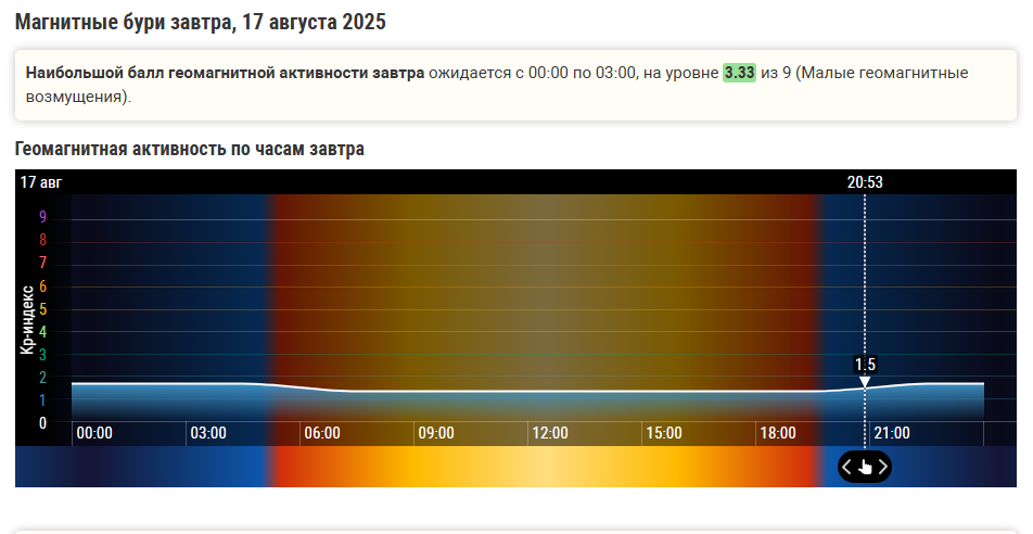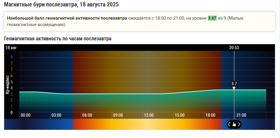 Магнитная буря начнется уже в воскресенье вечером, 17 августа. Геомагнитные колебания резко возрастут, утроившись с минимального значения в 1 балл до 3 баллов по 9-балльной шкале, и продолжат усиливаться к ночи, достигая 4 баллов. Наибольшей интенсивности буря достигнет в понедельник вечером, 18 августа, когда ее сила достигнет 5 баллов. После этого активность пойдет на спад: к четвергу, 21 августа, она снизится до 3 баллов, но ненадолго, поскольку в пятницу, 22 августа, вновь поднимется до 4 баллов.