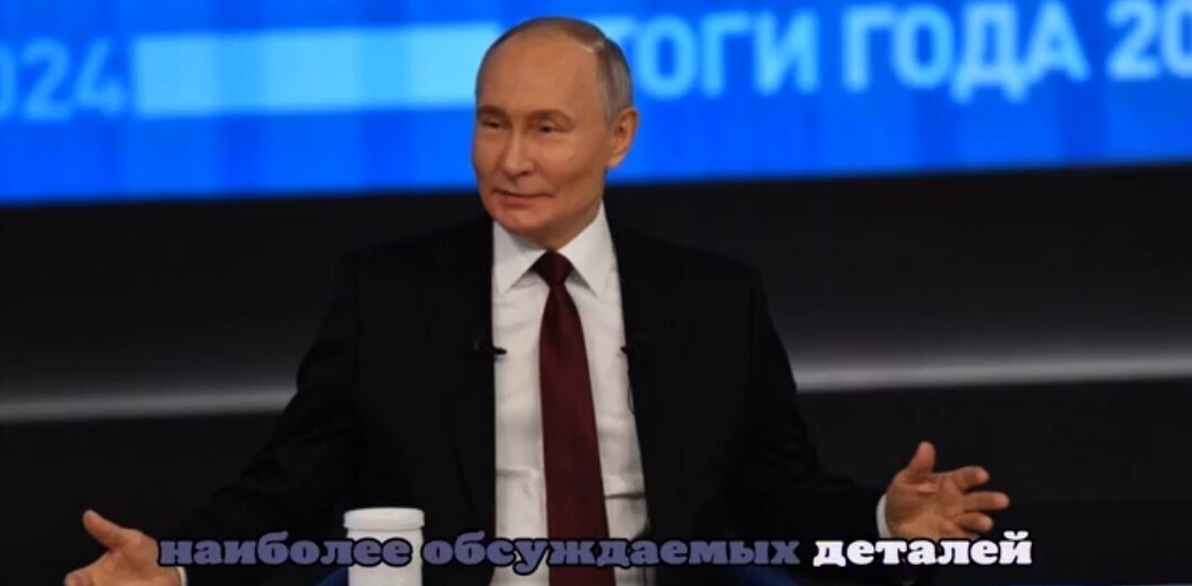 «Ну, это шутка, как вы можете догадаться». И тут на сцену выходит Путин, с лёгкой ухмылкой замечая: «Империалист!». Все смеются.