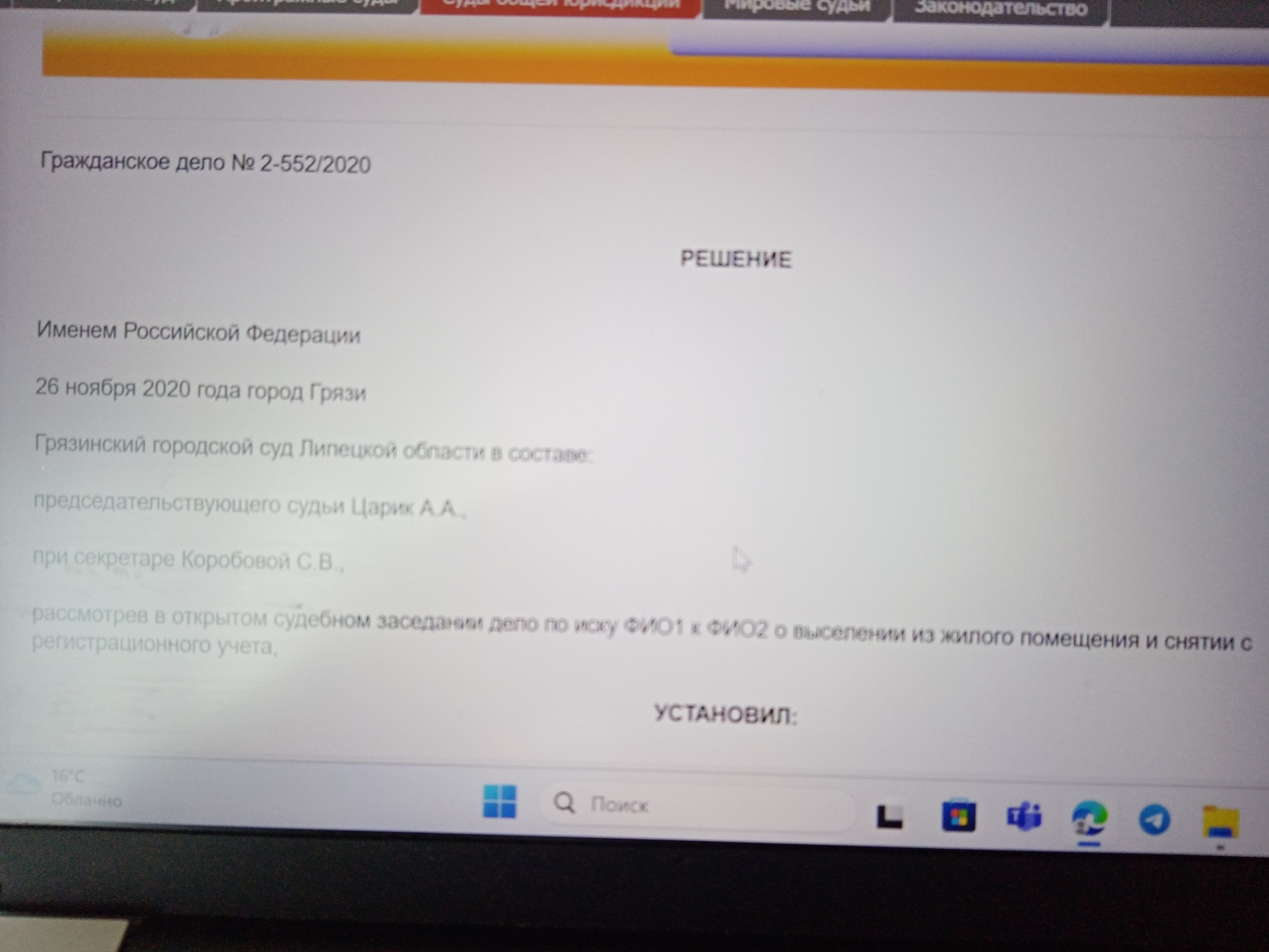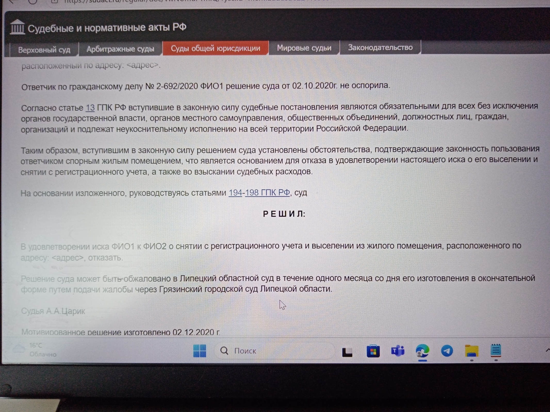 Для примера, предоставляю решение суда с отказом о выселении и снятии с регистрационного учета, ссылка.