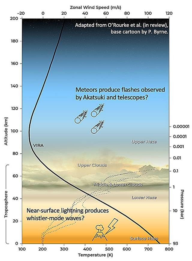Кроме того, существует мало доказательств того, что атмосфера Венеры, состоящая в основном из облаков серной кислоты, способна вызывать "грозы" с молниями.