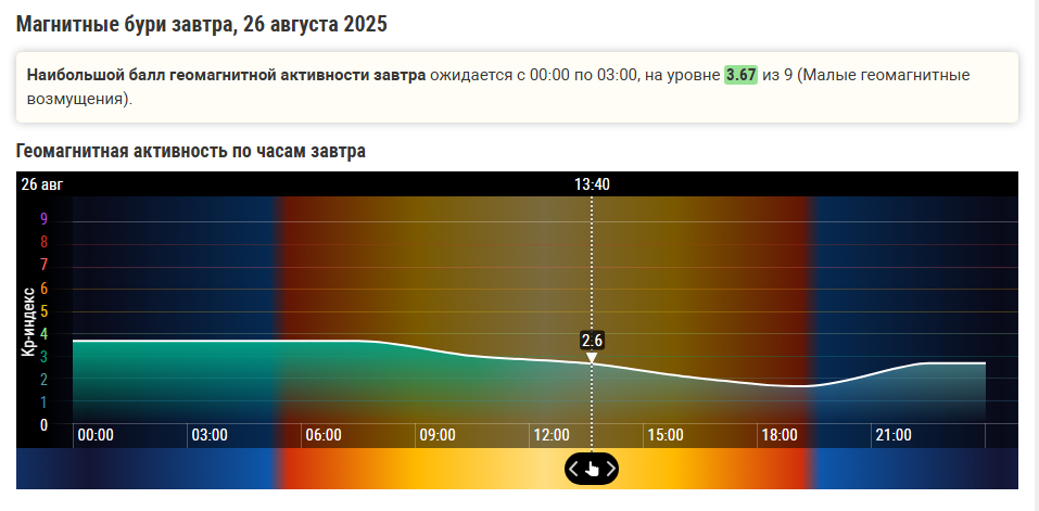 Прогнозируется, что геомагнитный индекс Kp 26 августа будет варьироваться от 2 до 4, с пиком в утренние часы. Наиболее высокая геомагнитная активность ожидается с 00:00 до 09:00 по московскому времени, когда индекс Kp может достигнуть 4, что соответствует "возбужденной магнитосфере".