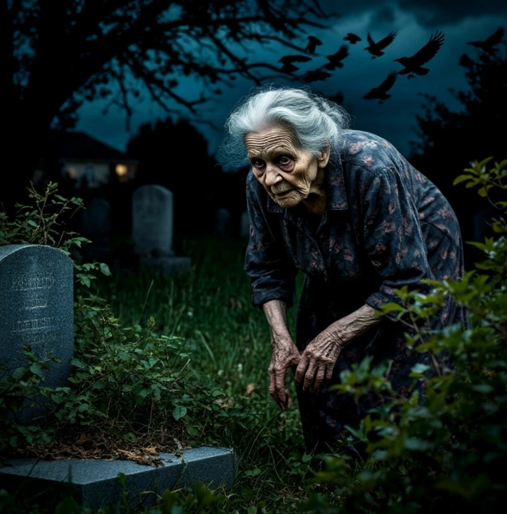 Проходит полчаса, а её нет. Таксист решает проследить за бабулей. Пробирается на кладбище и видит, что та, склонясь над свежевырытой могилкой, что-то делает. Тут под ногами мужика хрустнула ветка. Старуха резко обернулась. Руки её и лицо были в крови, а глаза злобно горели в темноте. Таксист спросил: «Бабушка, а что это вы тут делаете?» На что старуха ответила: «Не видишь что ли, мясо ем!!!».