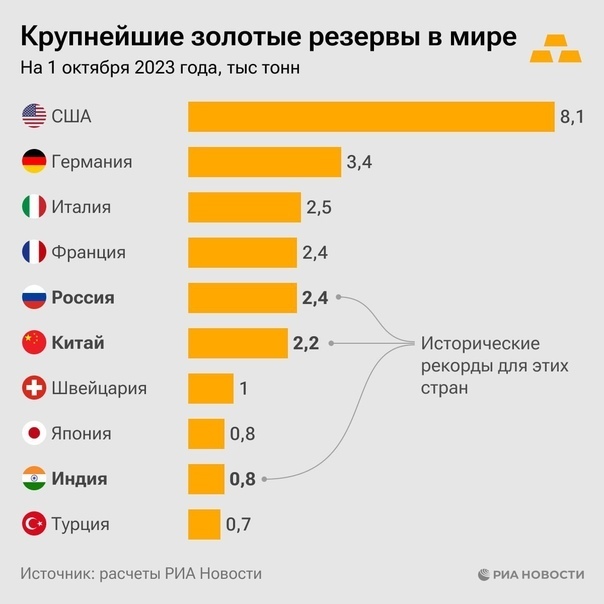 На 2023 год десятка наиболее богатых стран по запасам золота описывалась следующей диаграммой.