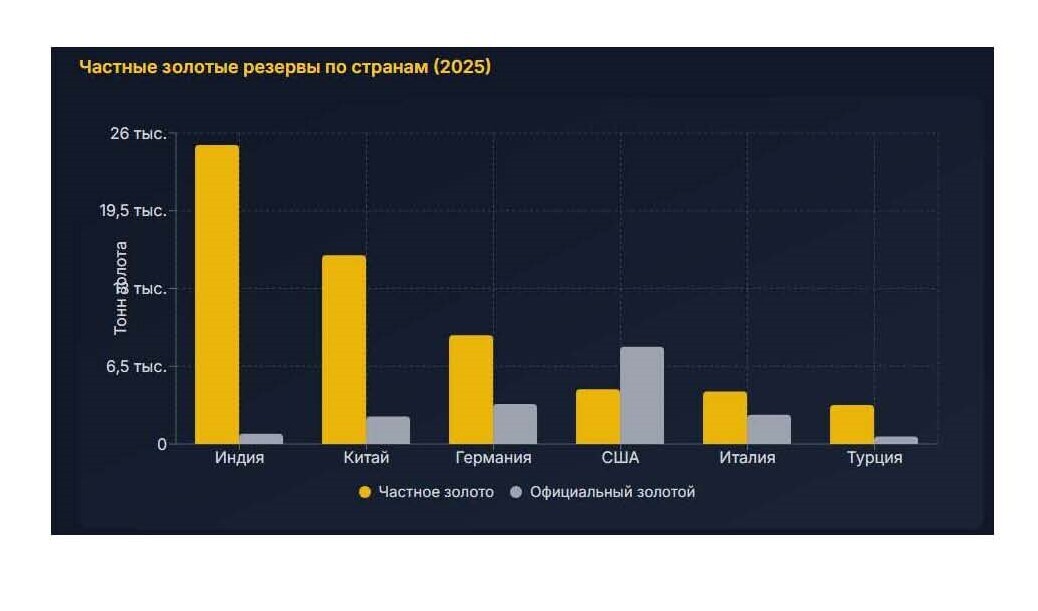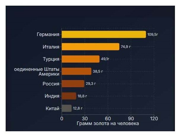 Индия и Китай - самые многочисленные по населению страны мира, в каждой примерно по 1 миллиарду 400 миллионов жителей. Аналитик Али Карадаг сделал оценку и по количеству частного золота на душу населения. И рейтинг стран опять изменился. Количество золота в граммах на одного человека, и немцы более всех других народов богаты на ювелирку и инвестиционное золото. Германия выделяется как страна с исключительными частными золотыми запасами, что отражает сильную ориентацию немецкого населения на безопасность при выборе инвестиций.