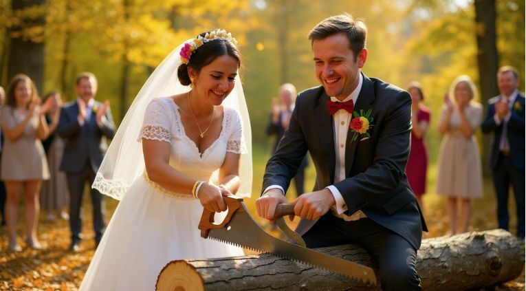 В Германии у пары есть необычный свадебный аттракцион — «бревно для распила» (Brautstock). После церемонии молодожёны получают пилу и огромное бревно, которое им нужно распилить вдвоём, двигаясь синхронно.