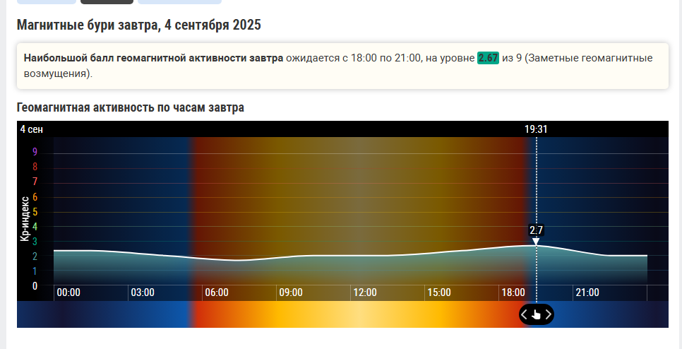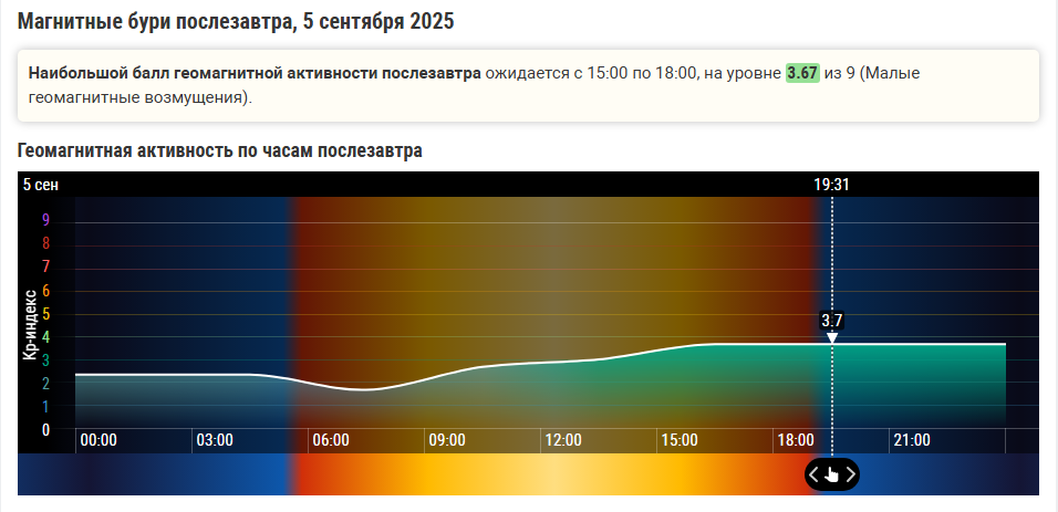 6 сентября: Ожидается постепенное снижение геомагнитной активности. Влияние магнитной бури будет ослабевать, однако остаточные явления могут наблюдаться.Ожидается небольшое геомагнитное возмущение. (Kp-индекс 4)