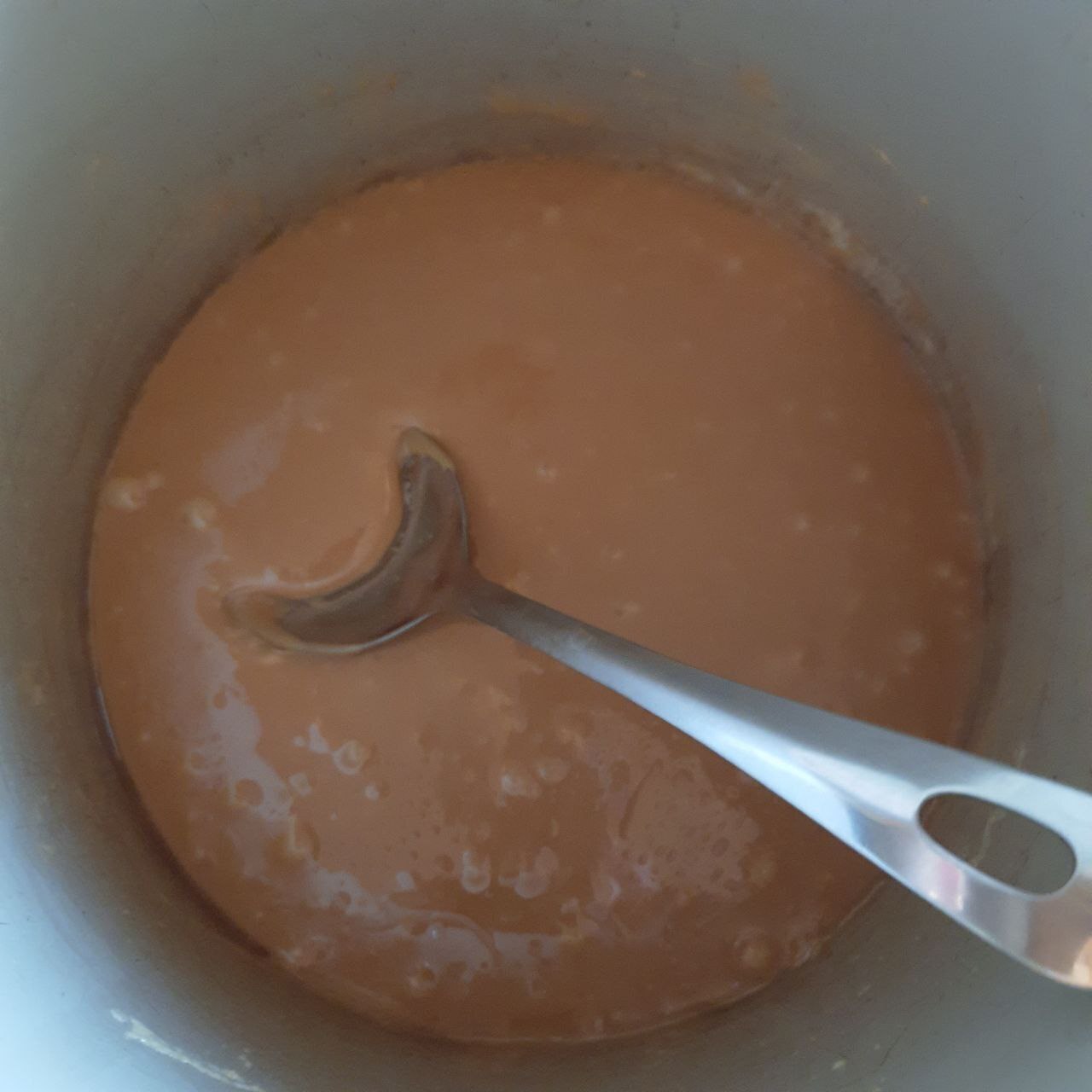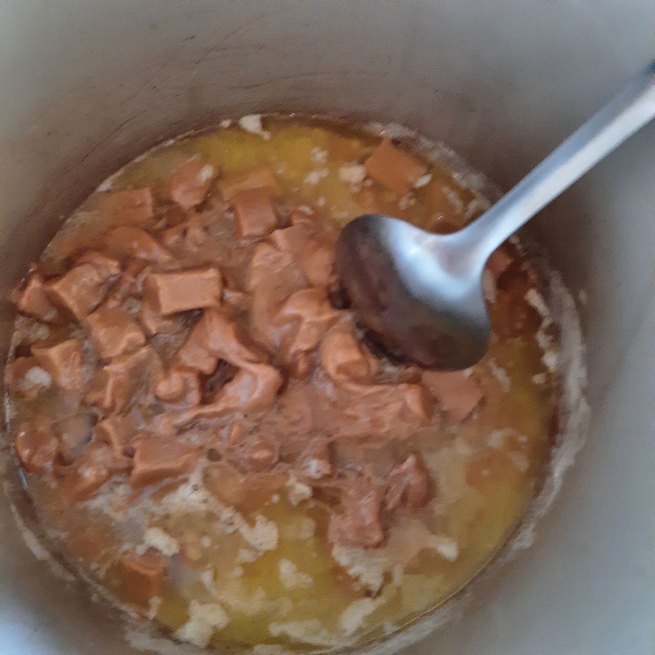 Сначала ириски "плавают в масле как комок", но немного терпения, масса должна стать похожей на карамельный соус, а масло полностью соединиться с конфетами.