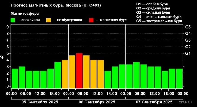 5 сентября 2025 года: Вероятность слабой магнитной бури (G1). Возможны небольшие перебои в работе электроники, незначительное ухудшение самочувствия у метеочувствительных людей.