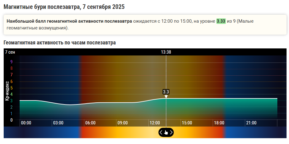 6 сентября 2025 года: Вероятность умеренной магнитной бури (G2). Более ощутимые перебои в работе радиосвязи и навигационных систем, повышенная утомляемость, головные боли у людей с чувствительным организмом.