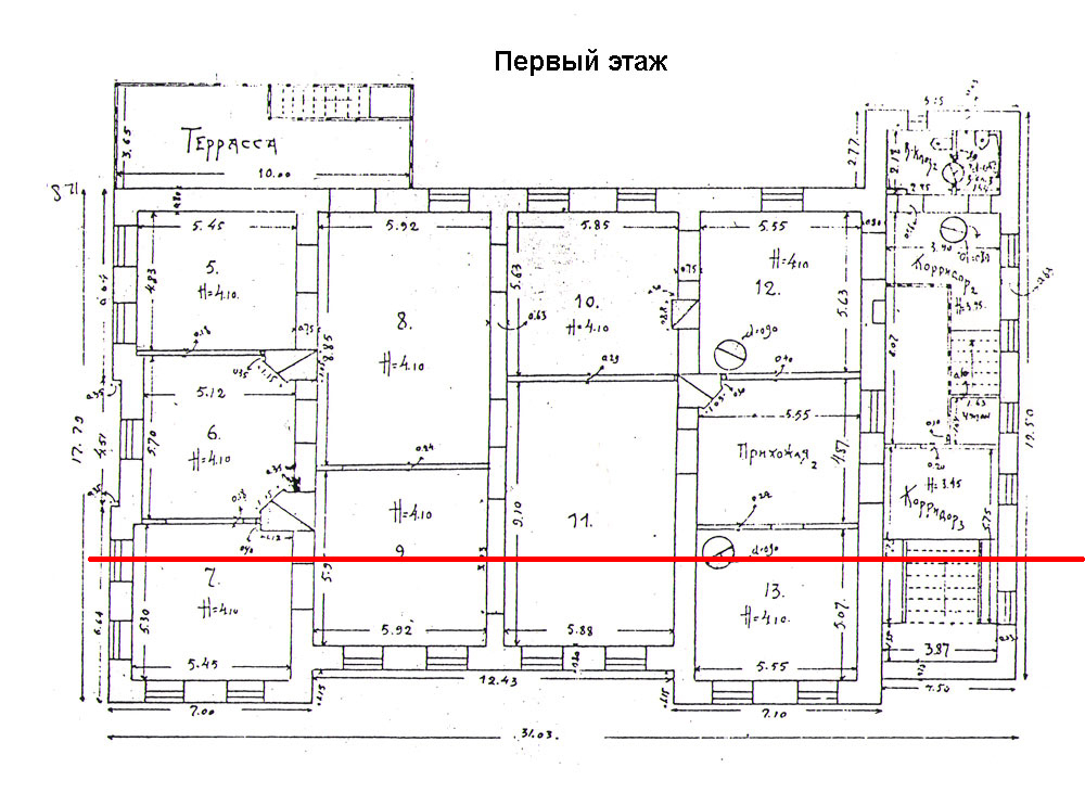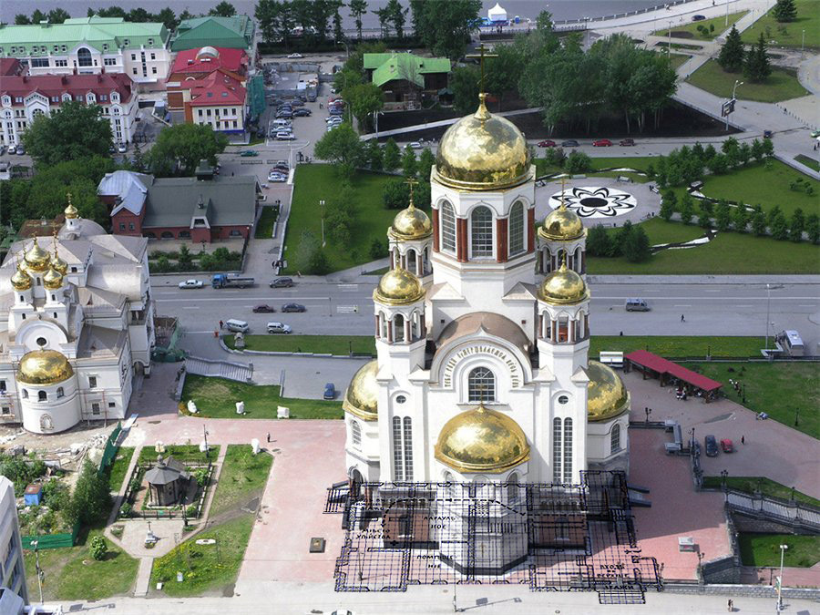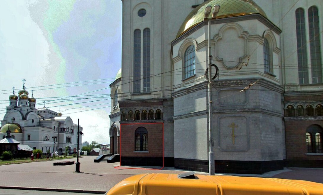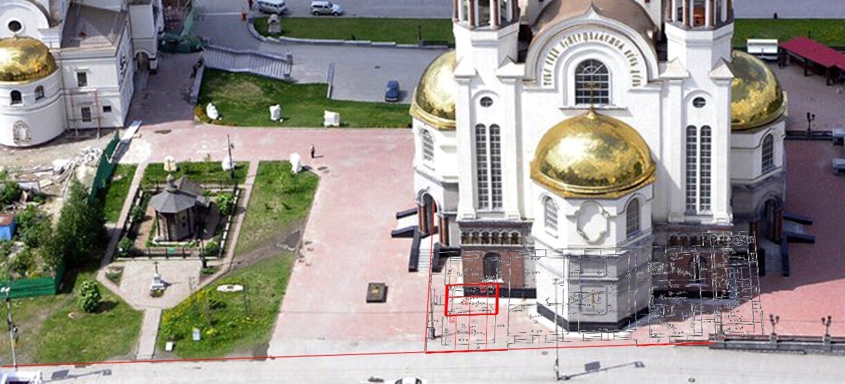Интересно то, что храм построили не на месте расстрельнной комнаты царской семьи. Она вообще не попала под его основание. На фото наложение чертежей дома Ипатьева и храма. Храм отодвинут назад по перспективе от переднего фасада дома Ипатьева на 12 метров дальше. Фактически храм стоит на краю задней части дома. Красная линия на чертеже- край фасада храма. Даже тут накосячили...