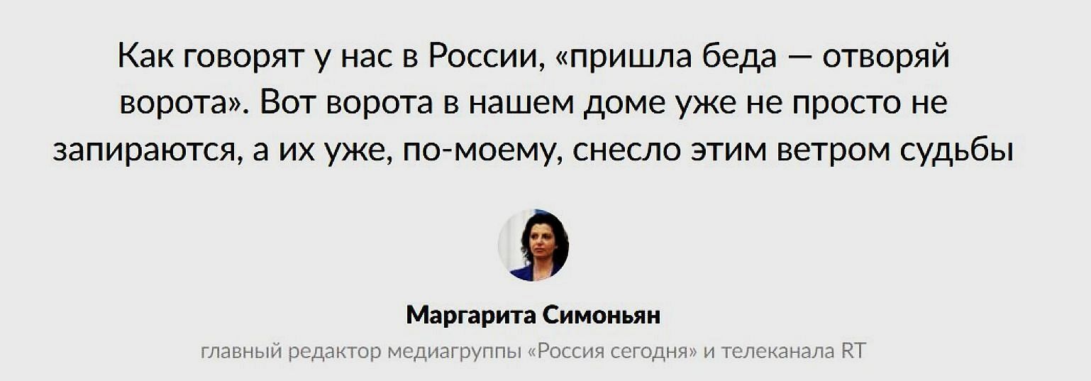 Маргарита также рассказала о состоянии своего мужа Тиграна Кеосаяна, который лежит в коме с конца прошлого года. Побелевшая от горя журналистка призналась, что в первое время после случившегося даже думала отправиться воевать, чтобы расстаться с жизнью. Но в итоге нашла в себе силы бороться. Сейчас, говорит Симоньян, режиссер впервые за долгое время начал реагировать на слова и прикосновения, что вселяет в нее надежду на его выздоровление.