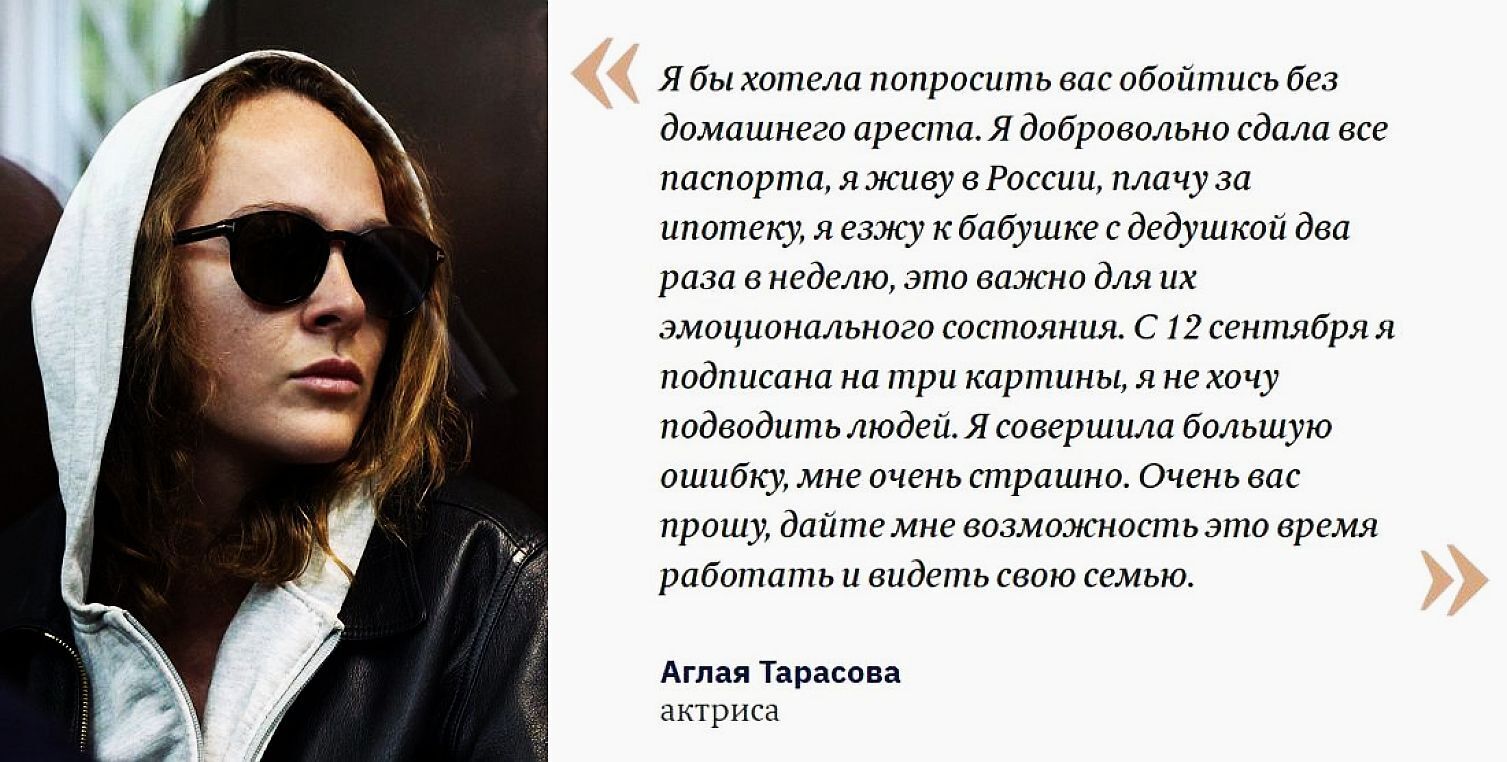 Прокурор требовал домашнего ареста, но и эта ласковая мера показалась Аглае ужасной и она быстро вспомнила о бабушке, ипотеке и съёмках в кино, а так же честно призналась, что «совершила большую ошибку».