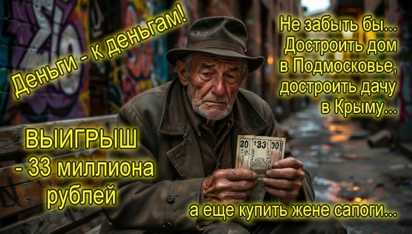 И вот теперь "тяжкий груз обременения неожиданными деньгами" утяжелен этим обещанием. Муки совести, буквально снедают бедного пенсионера - "Я ей сказал, что, если выиграю, миллион дам. Вот сейчас уже не знаю даже"... Ведь кроме "подарочка кассирше" надо купить машину дочери, достроить сыну дом с Подмосковье и себе на старость дачу на Черном море... Ну так... еще по мелочи разойдутся, конечно... опять же незабвенные родственнички неожиданно вспомнят о любимом родственнике... То да сё... там да сям...