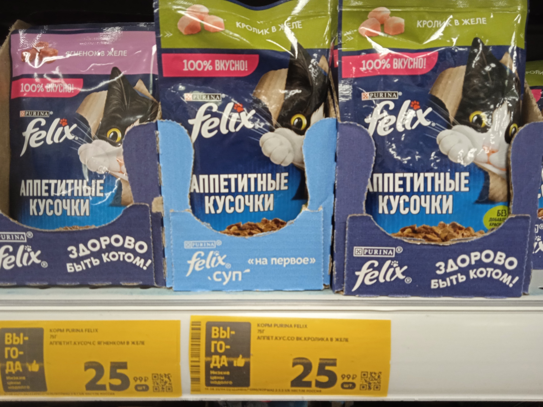 - Пакетики влажного корма FELIX достались мне за 14,4 рубля каждый;