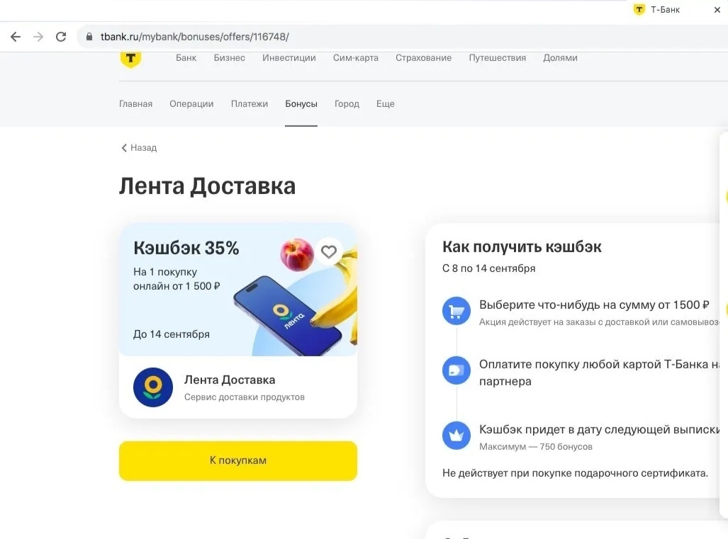 Как не крути, а от покупки продуктов питания никуда не деться. Как раз в этом направлении у Т-Банка есть отличные предложения по кешбэкам.